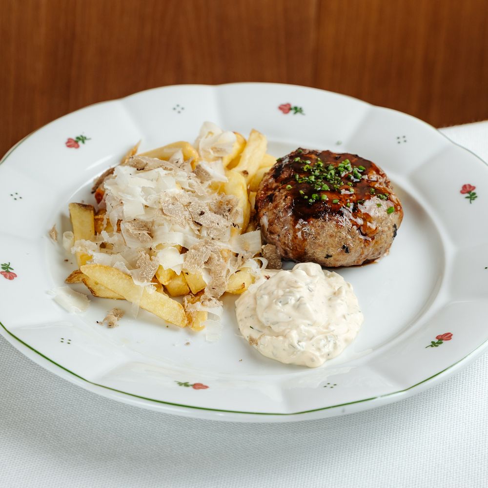 Бифштекс из говядины с луком, картофель фри, трюфельный демиглас, майонезно-горчичный соус с каперсами и маринованными огурцами, шичими, пармезан
