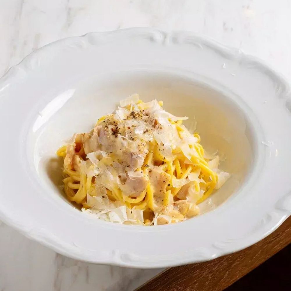 Паста домашняя (мука семола, яйцо куриное, мука пшеничная, масло оливковое, соль), яйцо куриное, сыр пекорино, сыр пармезан, бекон, свежемолотый черный перец
