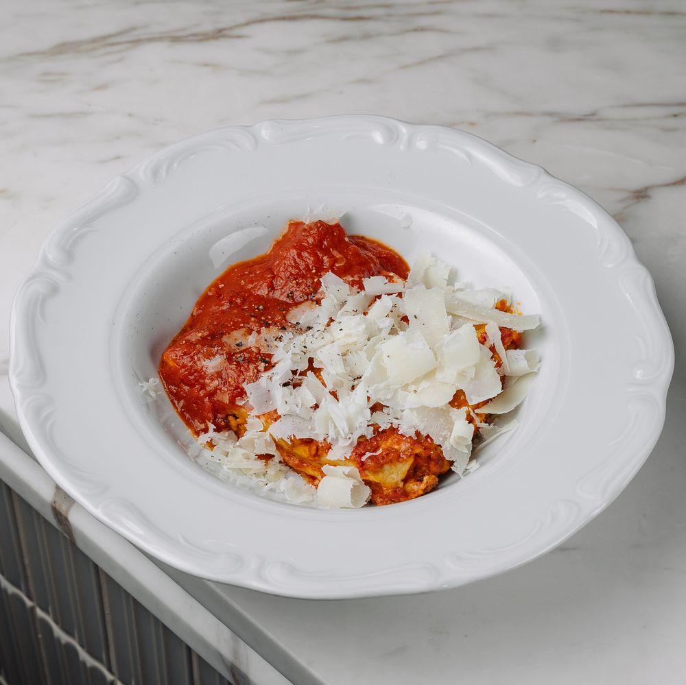 Паста домашняя (мука семола, яйцо куриное, мука пшеничная, масло оливковое, соль), соус бешамель (сливки, молоко, пшеничная мука), соус болоньезе (фарш из говядины и свинины, томаты в собственном соку, лук, вино, морковь, сельдерей, чеснок, розмарин, тимьян), соус наполи (томаты, лук, сельдерей, чеснок, базилик), сыр пармезан, масло сливочное
